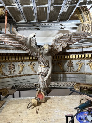 Fin 2025 sont prévus le dépoussiérage et le nettoyage des parties basse, la restauration en atelier des estrades et du parquet, sans oublier l’ange thuriféraire.