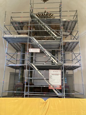 Les 29 et 30 juillet,la Somebat dépose l’échafaudage permettant de voir la qualité de la restauration d’un autel qui retrouve sa première jeunesse.
